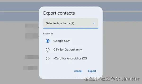 步骤 3:选择所需联系人,然后点击右上角的“更多操作”。选择“导出”,然后选择文件格式。最后,点击“导出”将联系人保存到您的电脑上。