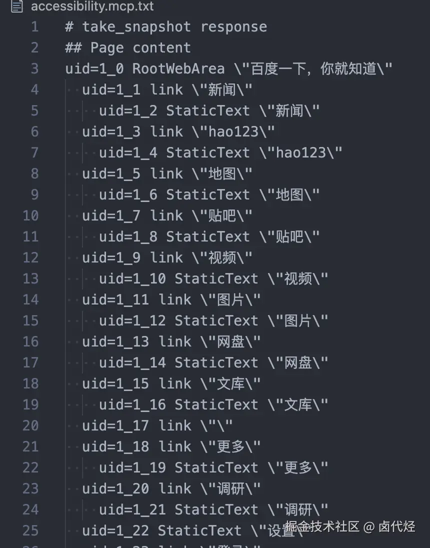 比如说这里我收集到的百度首页信息,从 devtools 控制台和 MCP 的 response 对比,可见内容是一致的: