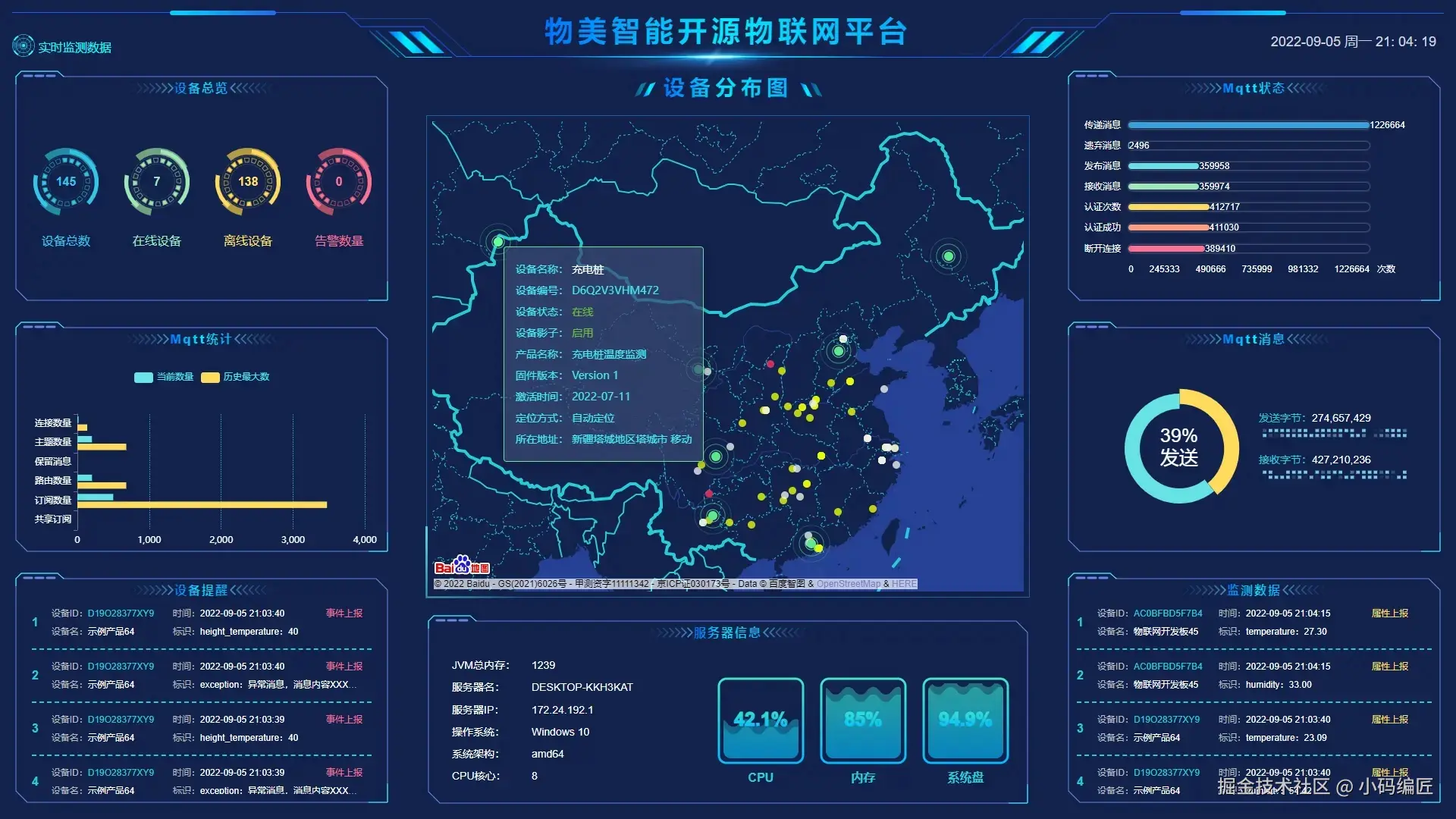它支持多种硬件设备接入、多端适配(Web、小程序、App)、多种数据库存储,并提供完善的权限管理与可视化监控功能。