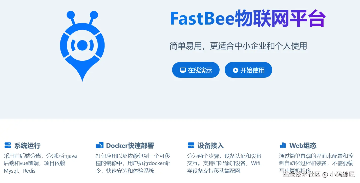 FastBee 是一个功能齐全、架构清晰的物联网平台,在降低物联网系统的使用和开发门槛。