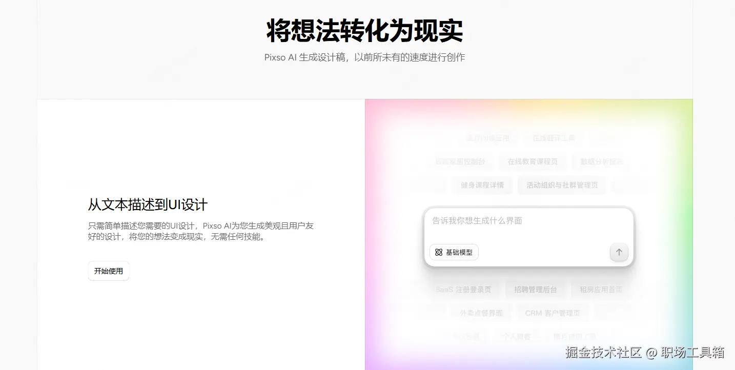 Pixso AI:自带 AI 功能 Pixso AI,提供 AI 文生设计稿、AI 文生图、AI 生成设计规范等,就其中的 AI 文生设计稿,输入 UI 设计需求,即可快速生成整套 UI 界面设计稿。