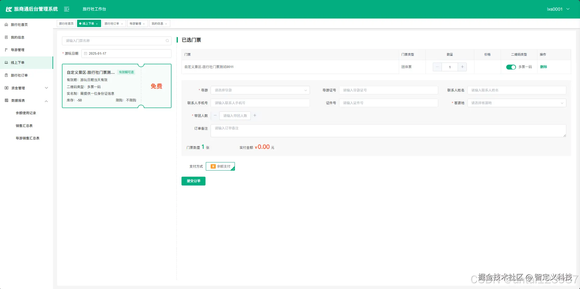 | 线上下单 | / | 可在线上下单页面进行门票购买,录入游客信息,关联导游,选择客源地,进行购票 |