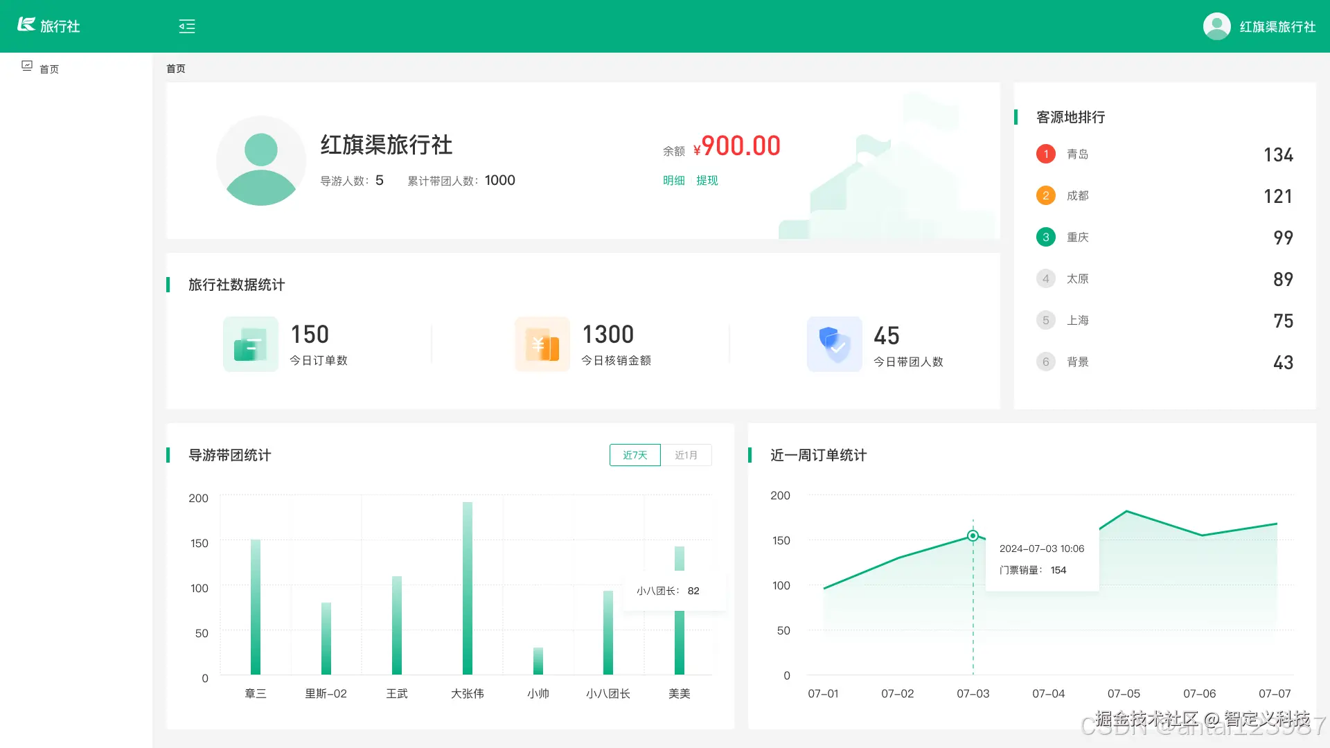 | 首页 | / | 展示旅行社名称、余额、导游、客源地排行、数据统计、近一周订单统计等 |