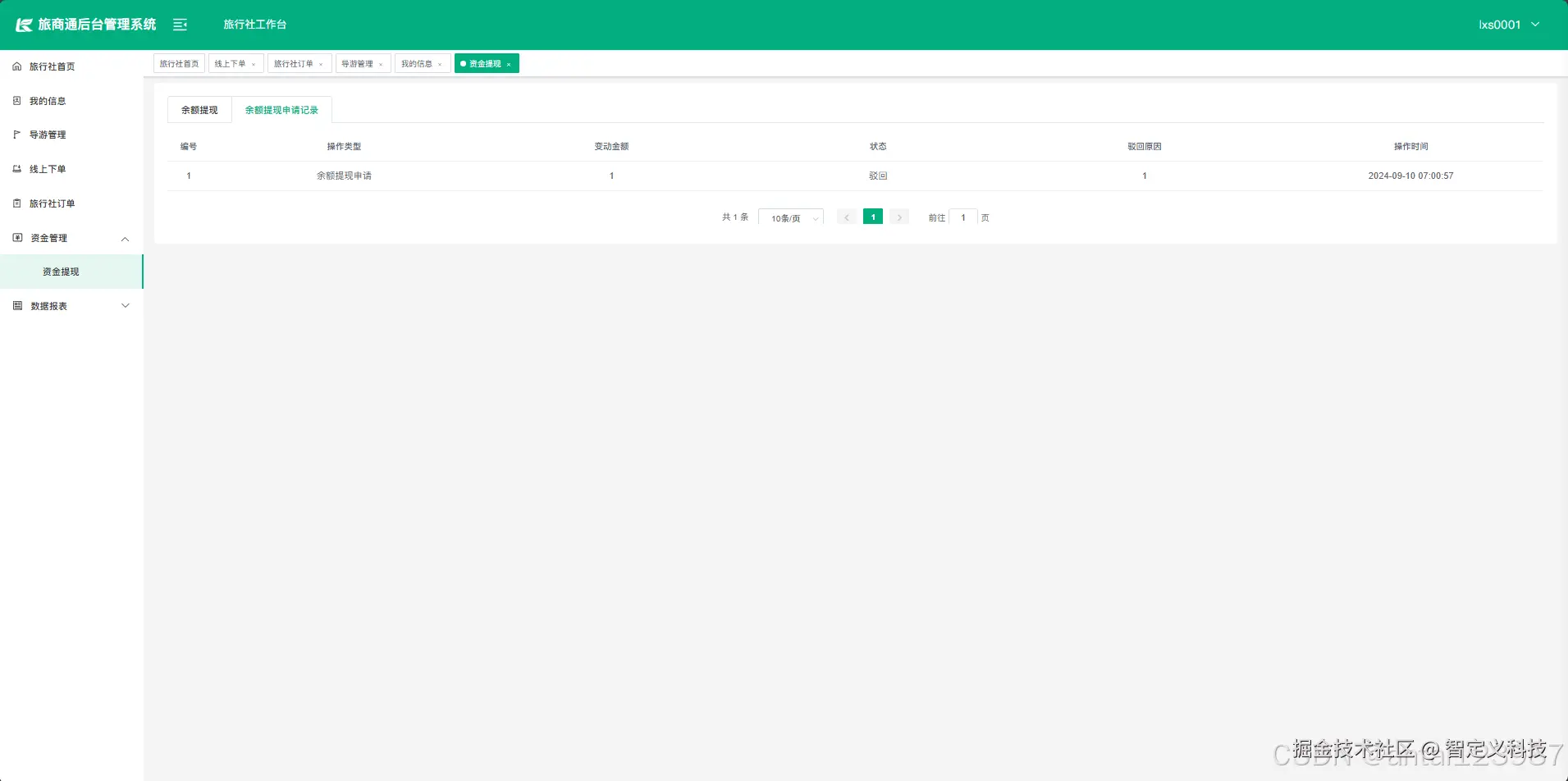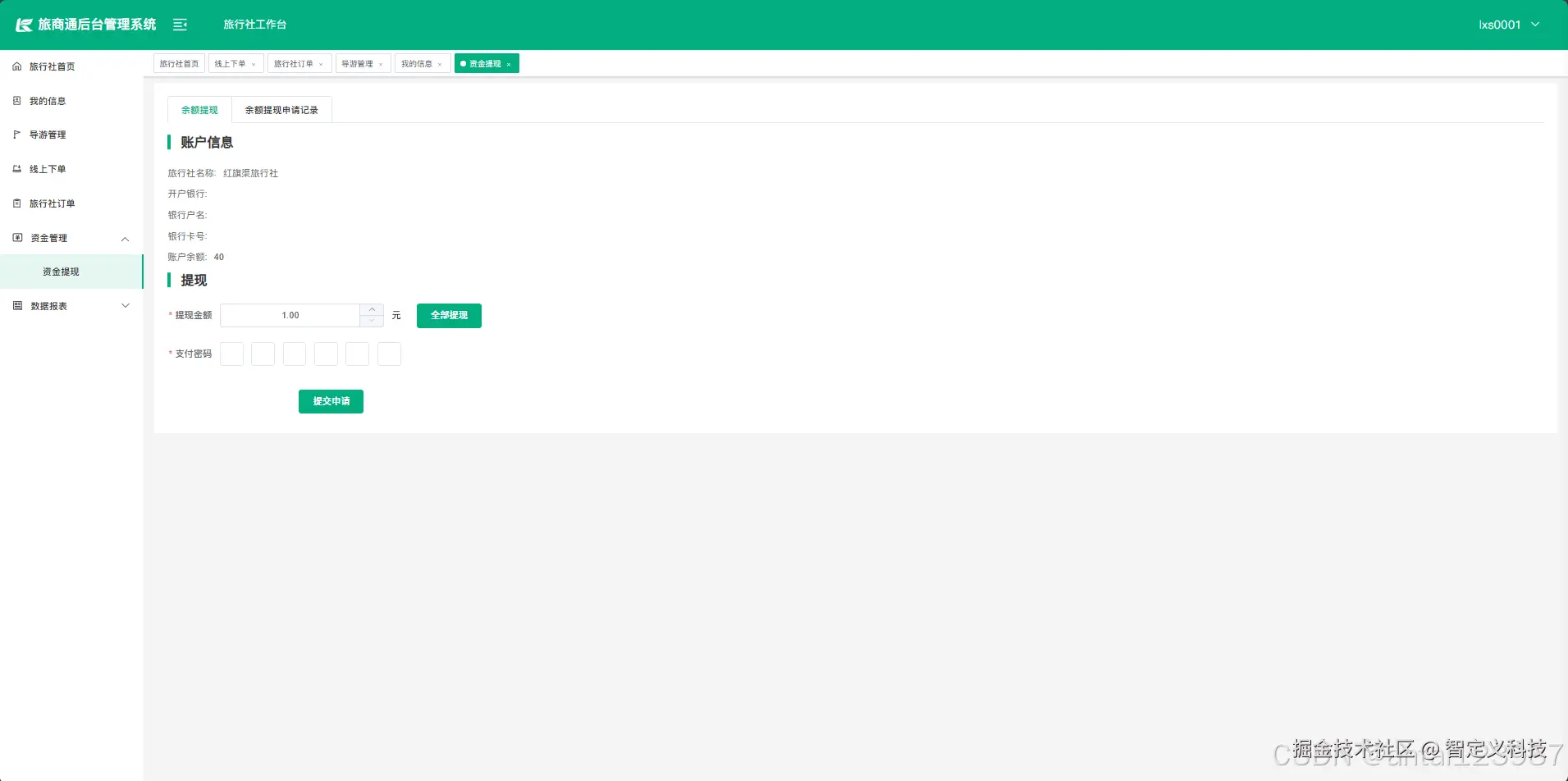 | 资金管理 | 余额提现 | 可进行旅行社余额提现,提现需运营公司管理员审核。 |