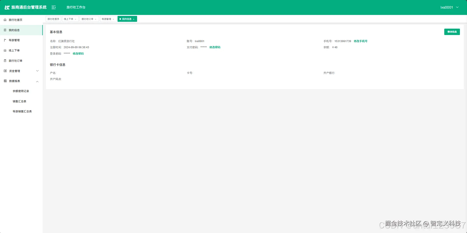 | 我的信息 | / | 展示当前旅行社基本信息,可进行重置登录密码、支付密码、更换手机号等操作。 |