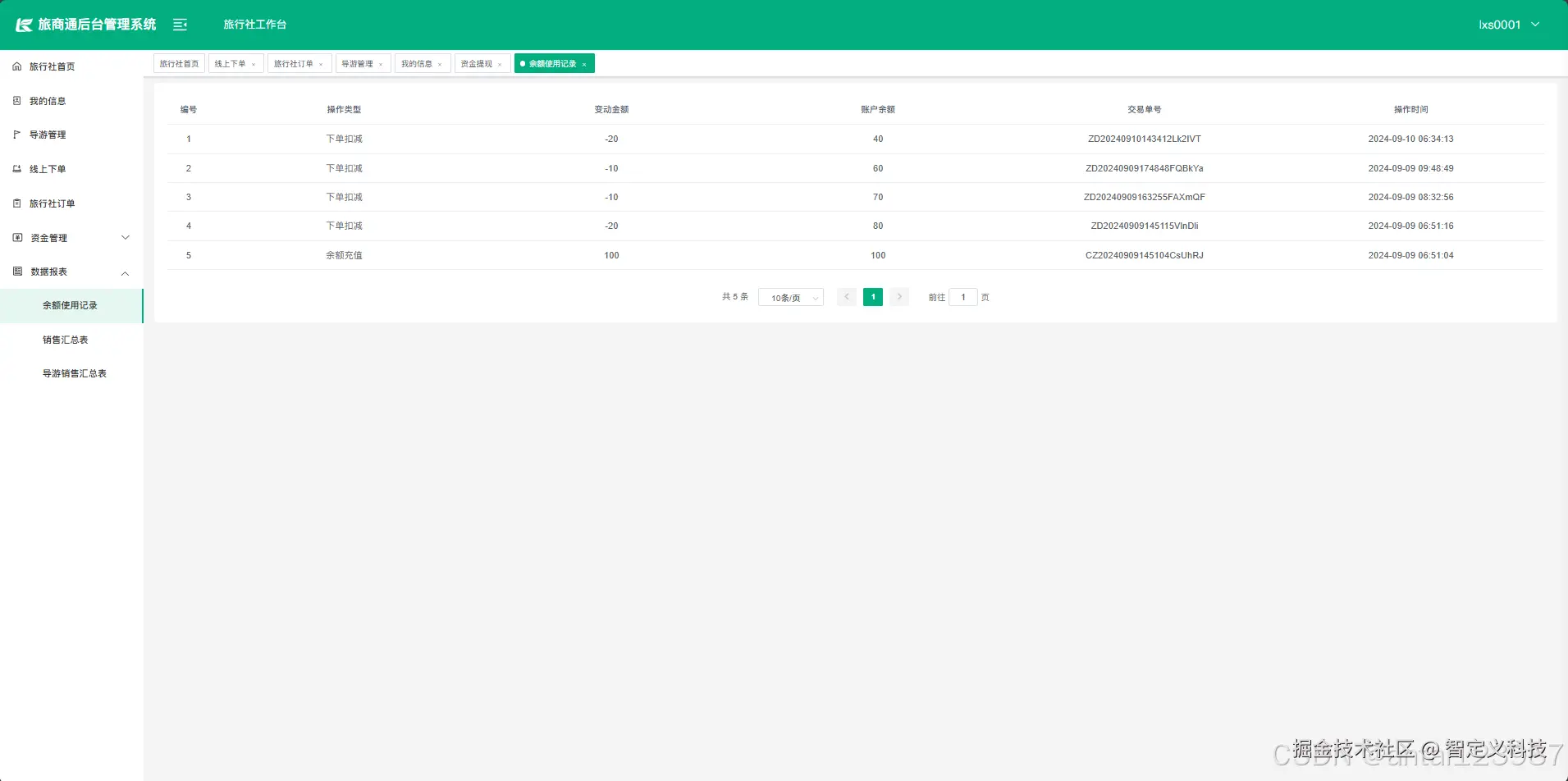 | 数据报表 | 余额交易记录 | 展示当前旅行社所有余额使用以及调整记录 |