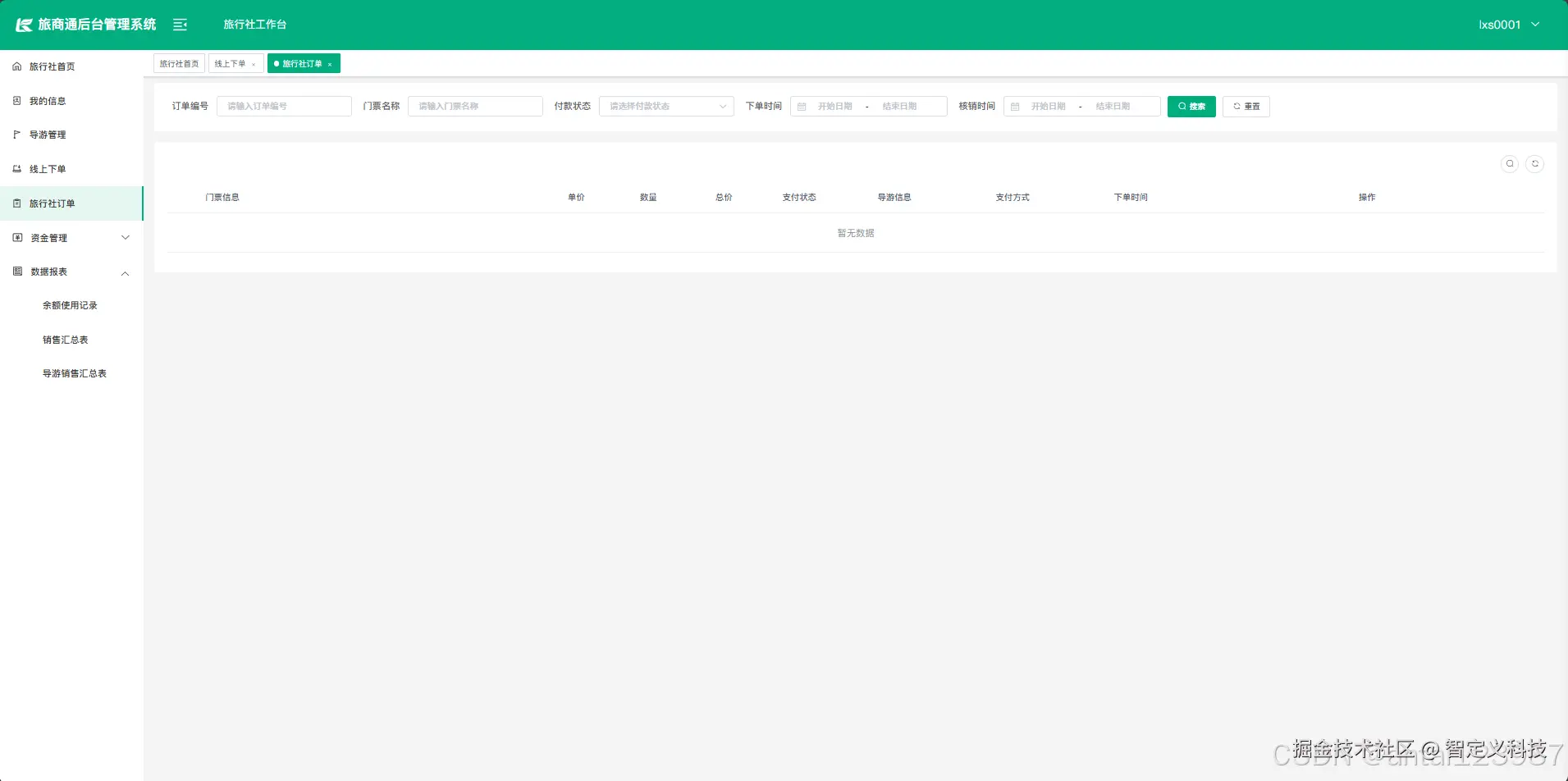 | 订单管理 | / | 展示当前旅行社所有门票订单,可查看详情,申请退款 |