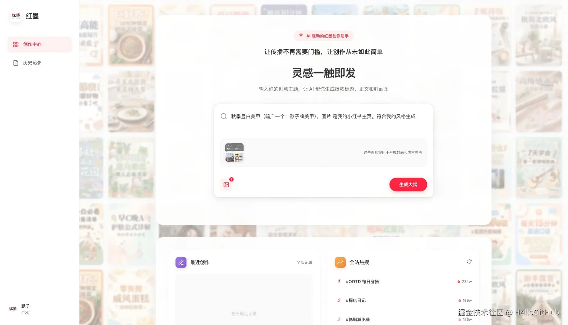 该项目是基于 AI 的一站式小红书图文生成工具,只需输入一句话描述主题,并上传主页截图作为风格参考,即可自动生成包含封面图和内容的完整图文笔记,支持重新生成单页内容、大纲预览和编辑等功能。