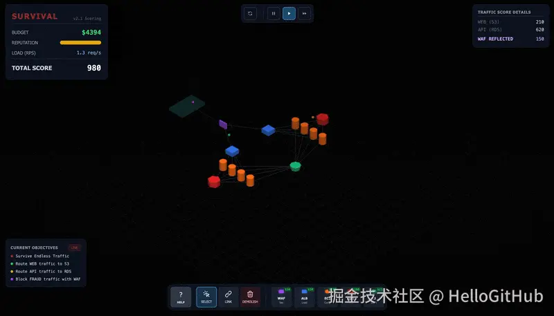 这是一个基于 Web 的塔防模拟游戏,旨在通过玩游戏的方式学习云架构知识。玩家在游戏中扮演云架构师,利用有限的预算搭建云基础设施。面对持续增长的访问流量和 DDoS 攻击,需要合理规划和部署资源,尽可能延长云服务稳定运行时间(生存更长时间)。