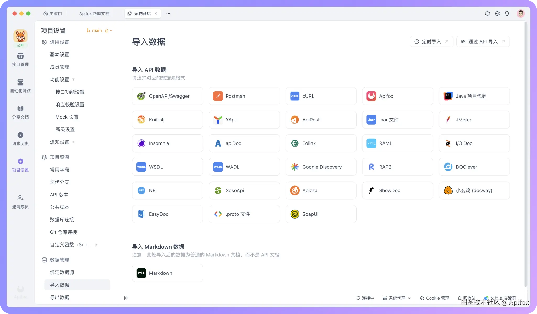 有时候你需要把其他地方的接口文档迁移到 Apifox 中。如果文档是标准格式,Apifox 本身已经支持多种导入方式:可以通过 IDEA 插件扫描代码中的接口,也可以导入 OpenAPI/Swagger 文件,还支持从 Postman 等其他工具迁移。