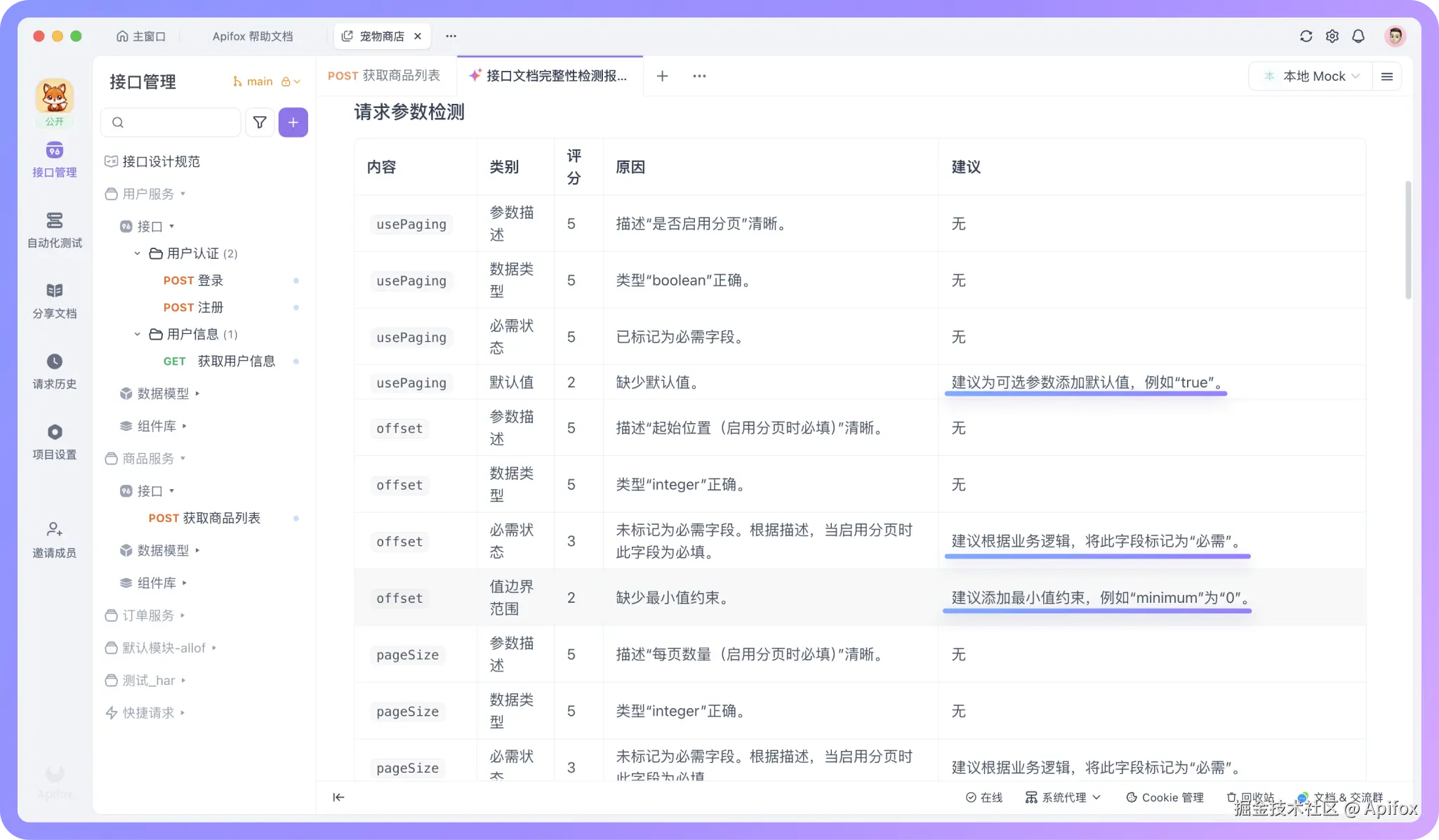 文档完善得差不多时,心里往往还是会有些不确定,可能会觉得有没有关键的信息还没补全?这时候就可以用 Apifox 的「接口文档完整性检测」功能,来检查文档中是否存在遗漏的地方。