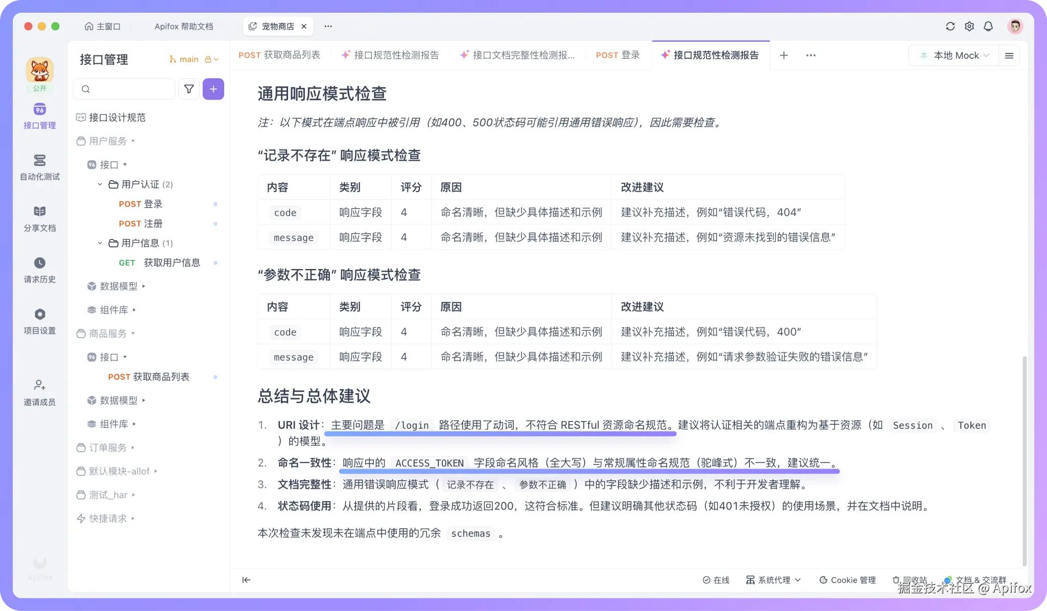 Apifox 的「接口规范性检测」会从多个维度审查你的接口文档。它会检查命名是否一致,如果有些字段用了动词,有些用了名词,AI 会建议统一使用其中一种风格。