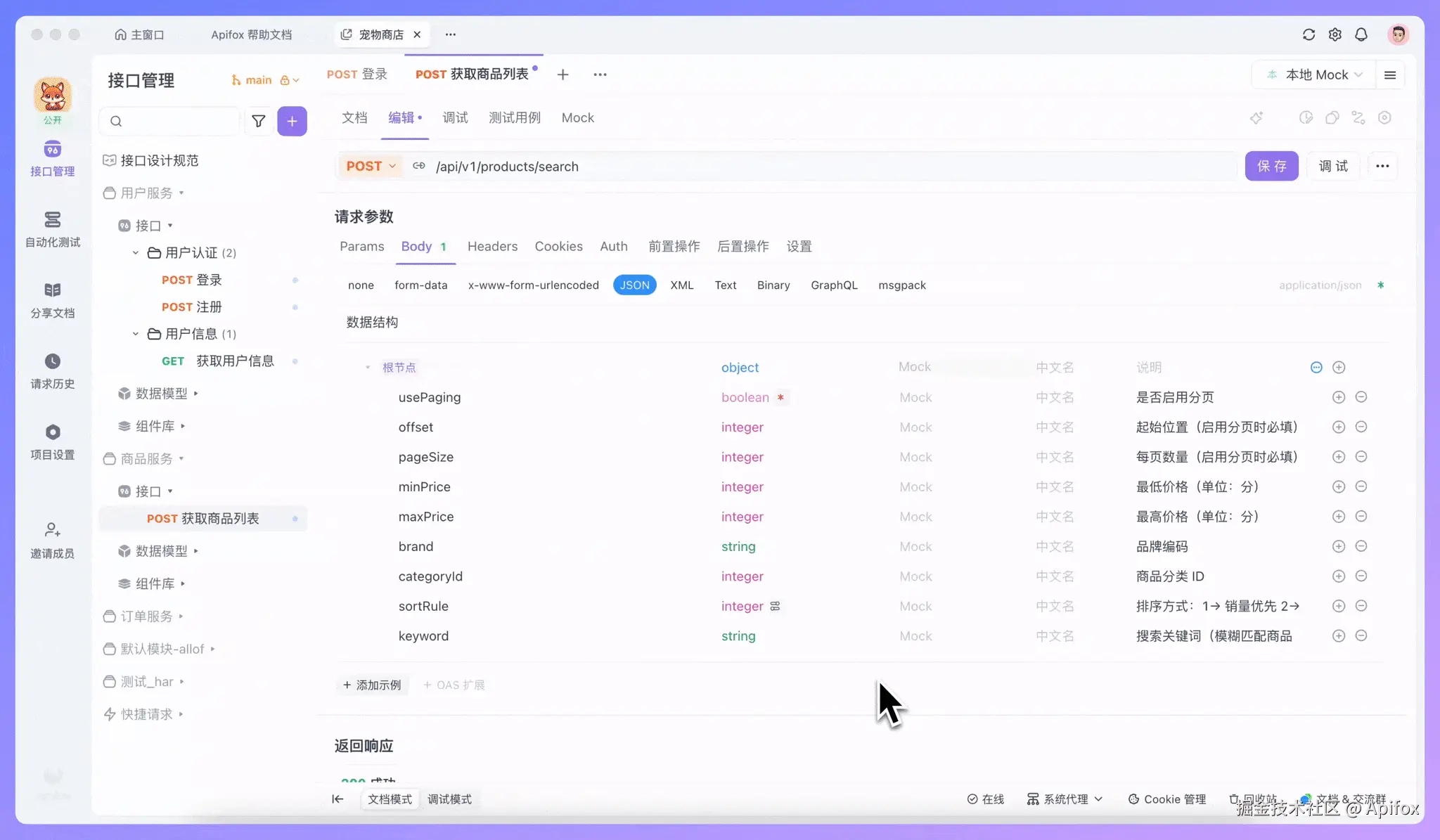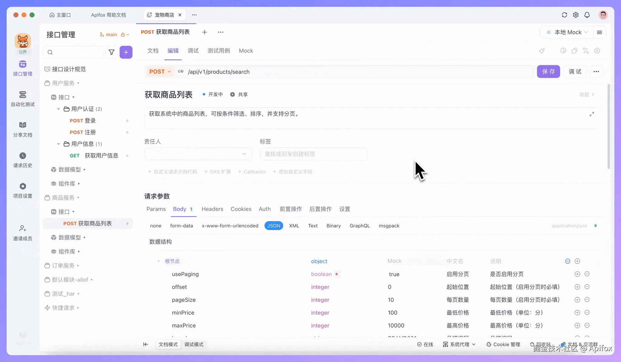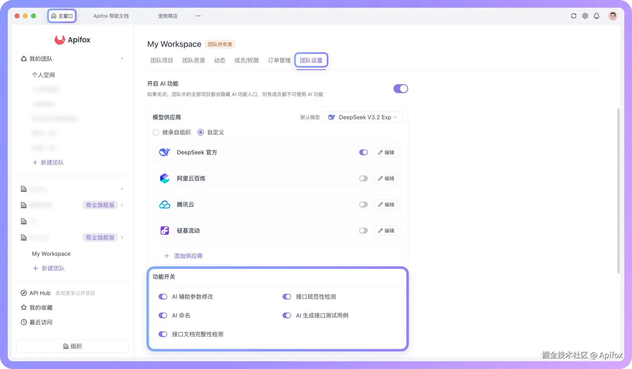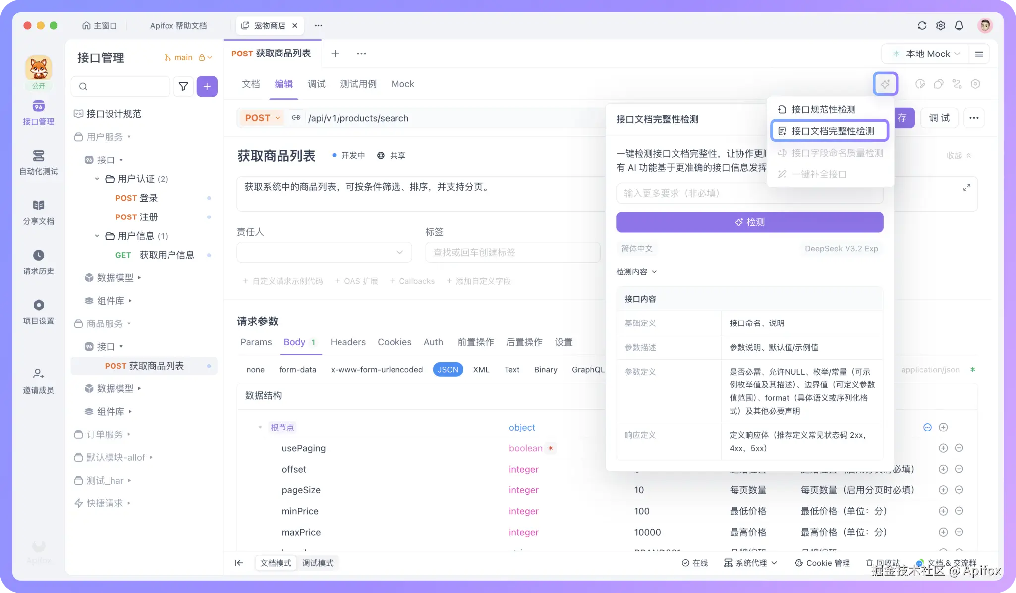 下面我们就来看看,如何在 Apifox 中借助 AI 设计一份更规范的接口文档。在开始之前,请确认你已经将 Apifox 更新到最新版,并已开启 AI 功能和配置 AI 模型。