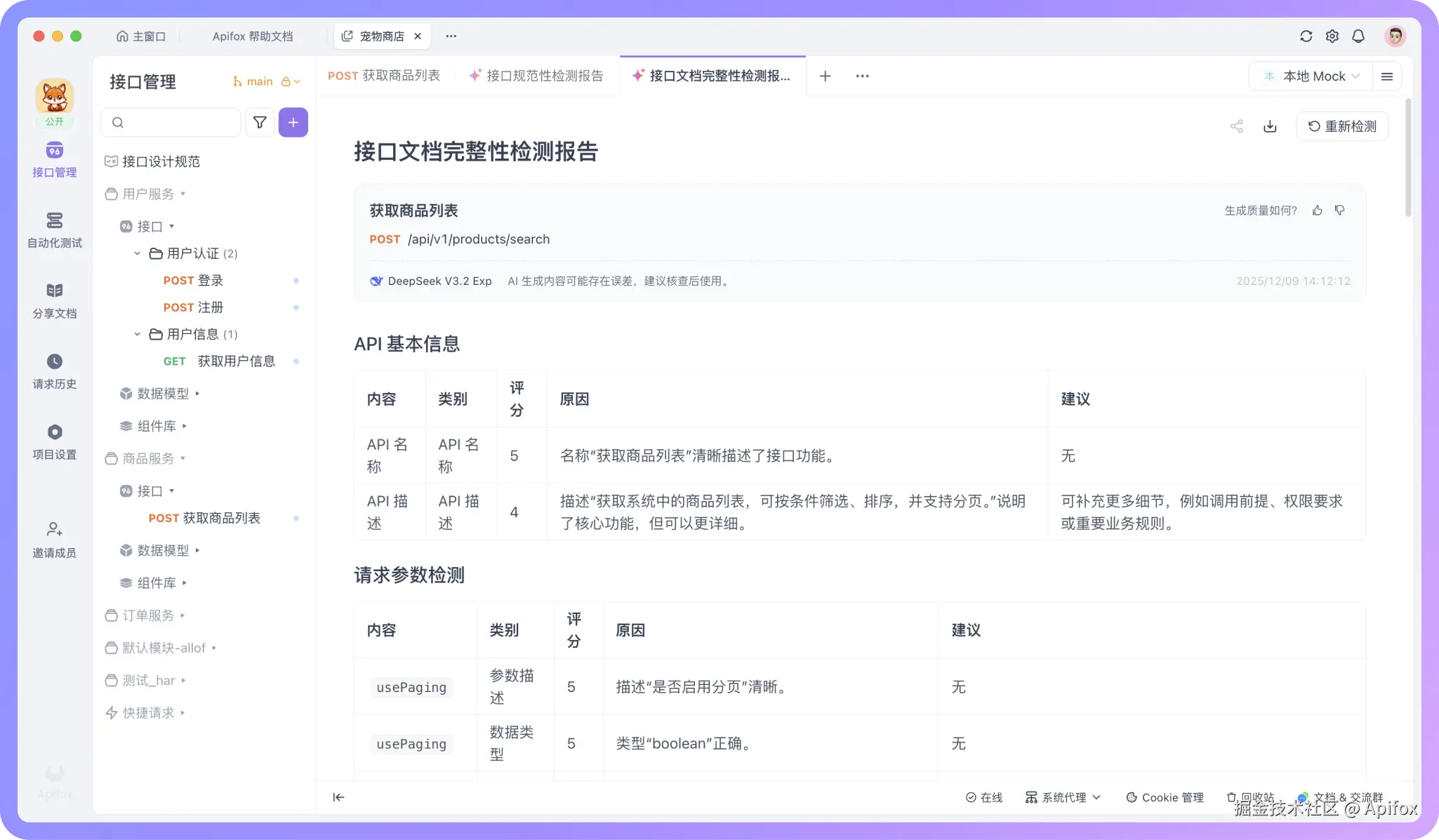 AI 会扫描你当前接口的接口文档,从多个角度检查可能的遗漏。检测完成后,会生成一份详细的报告,接口文档的每个检测内容都会进行打分。