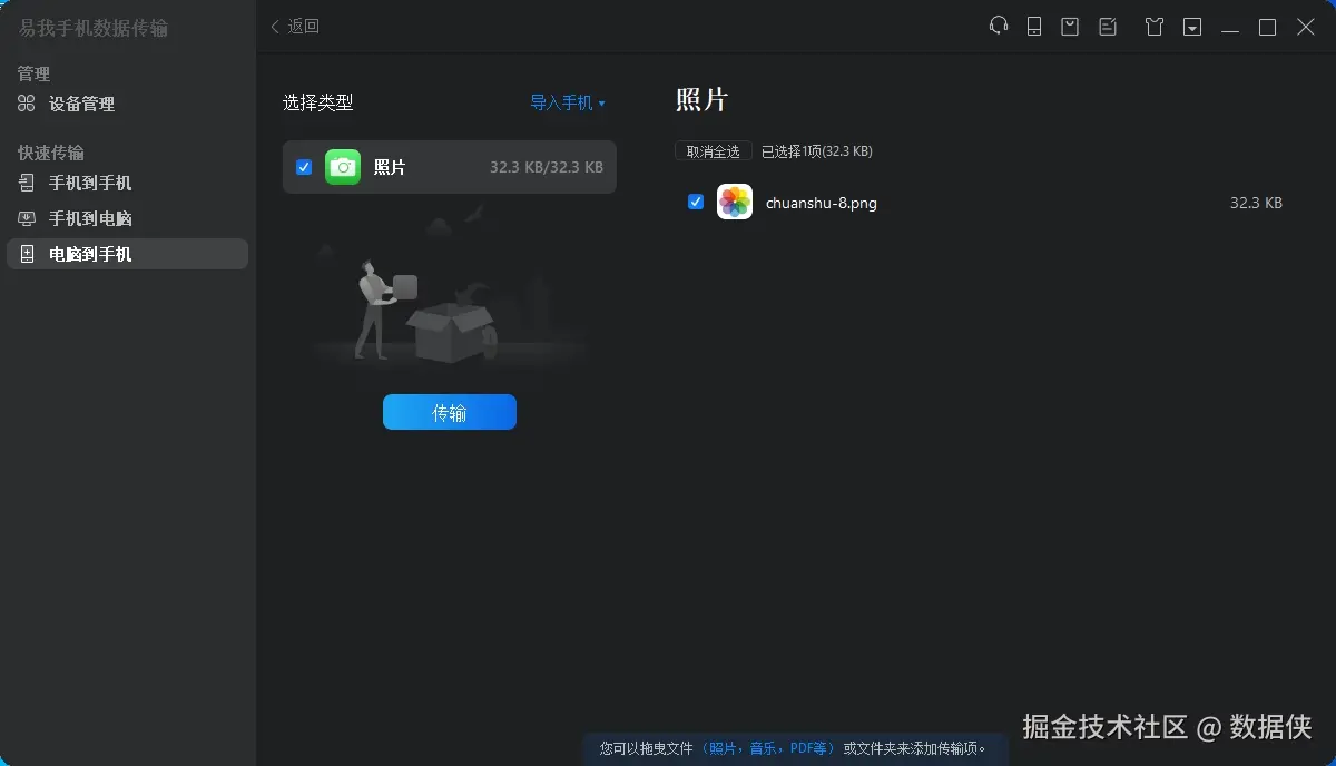 步骤3. 现在,打开文件的位置,选择您想传输的文件类型。选择所需文件后,点击「传输」。您也可以拖曳文件(照片,音乐,PDF等)或文件夹来添加传输项。