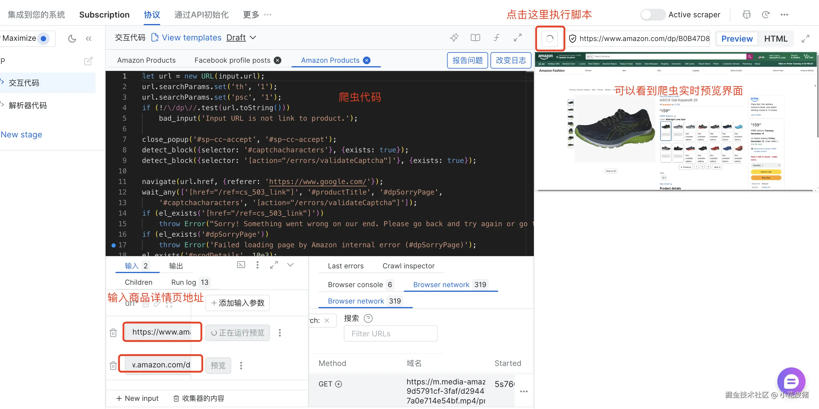 我们在下面输入的地方输入商品的详细地址,随后点击右上面的执行脚本按钮,可以看到爬虫实况