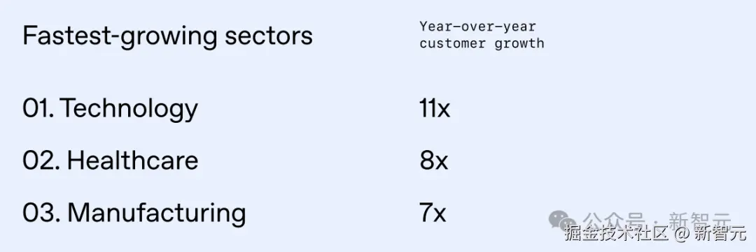 具体增长数据为:科技行业增长 「11 倍」,医疗保健增长 「8 倍」,制造业增长 「7 倍」。