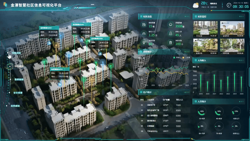 智慧社区可视化大屏的设计目标在于提供一个全面、直观的社区信息展示平台,实现以下功能: