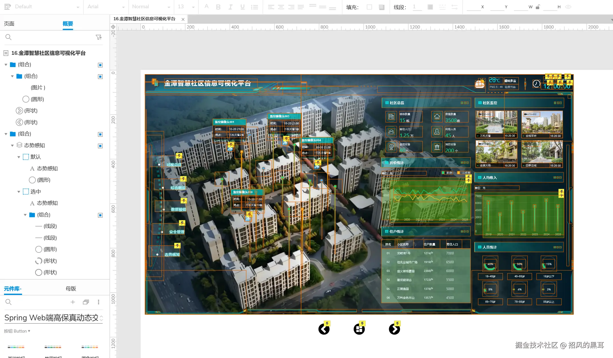 - 元件添加:在各功能区域内添加所需的元件,如文本框、图表、图片等。例如,在社区总览区域添加文本框展示基本信息,在社区监控区域添加图片展示监控画面。