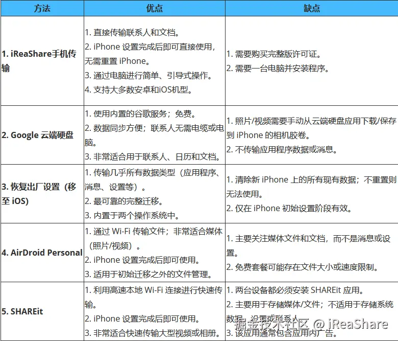 即使完成初始设置后,您仍然可以通过多种方式将 Android 手机中的数据传输到 iPhone。如果您使用iReaShare Phone Transfer这款专用应用,可以直接将 Android 数据复制到 iPhone。您还可以使用 Google Drive、AirDroid 和 SHAREit。如果 iPhone 上没有重要文件,您可以重置 iPhone,然后使用“转移到 iOS”功能传输数据。