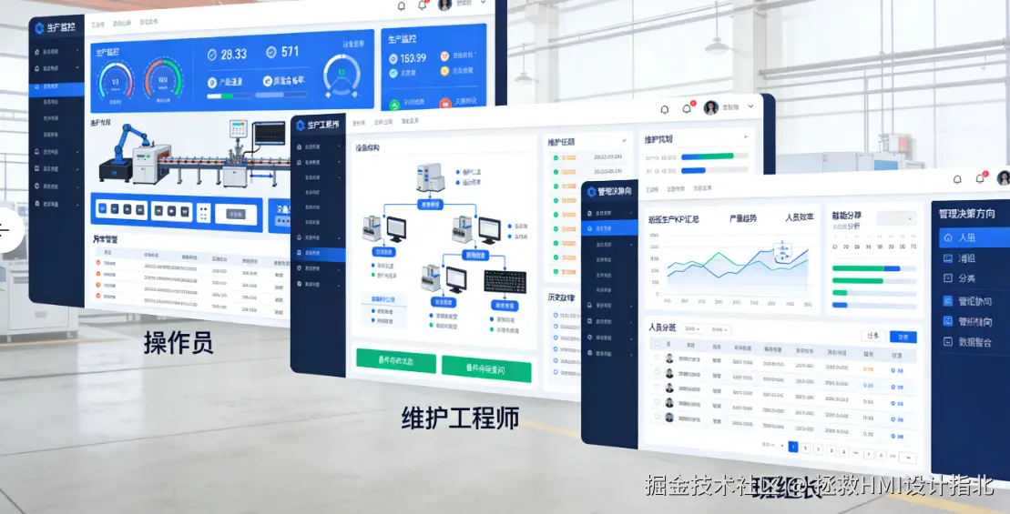 用户角色 固定: 可以针对“操作员”、“维护工程师”、“班组长”等不同角色进行精准的界面设计。