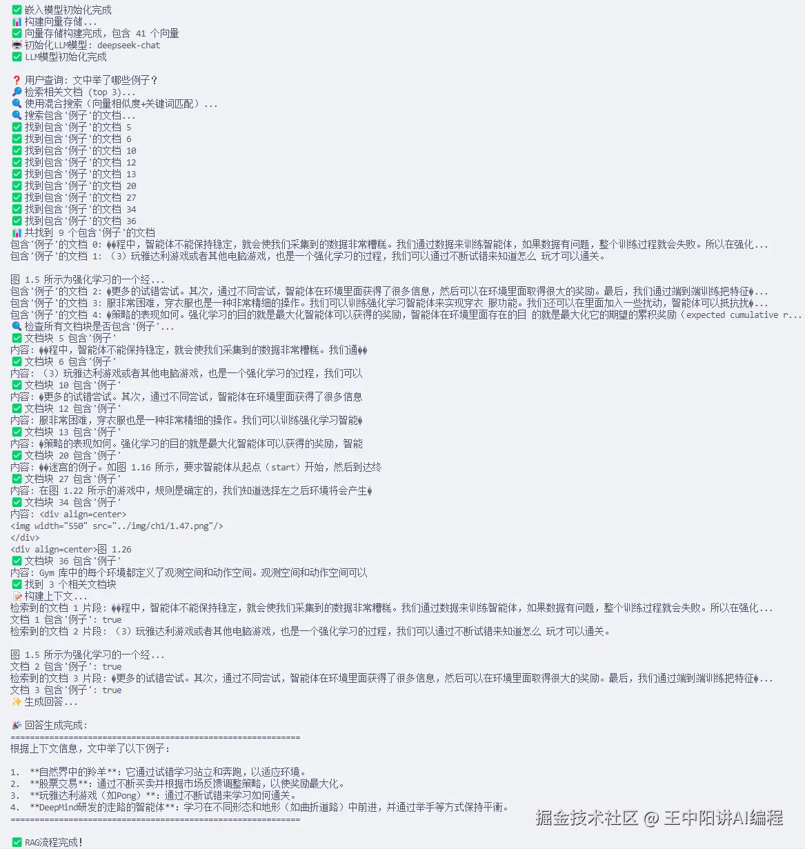 这种策略将语义理解和精确关键词匹配相结合,显著提高了检索准确率。特别是对于"文中举了哪些例子?"这类具体查询,关键词匹配能有效召回包含特定术语的文档。