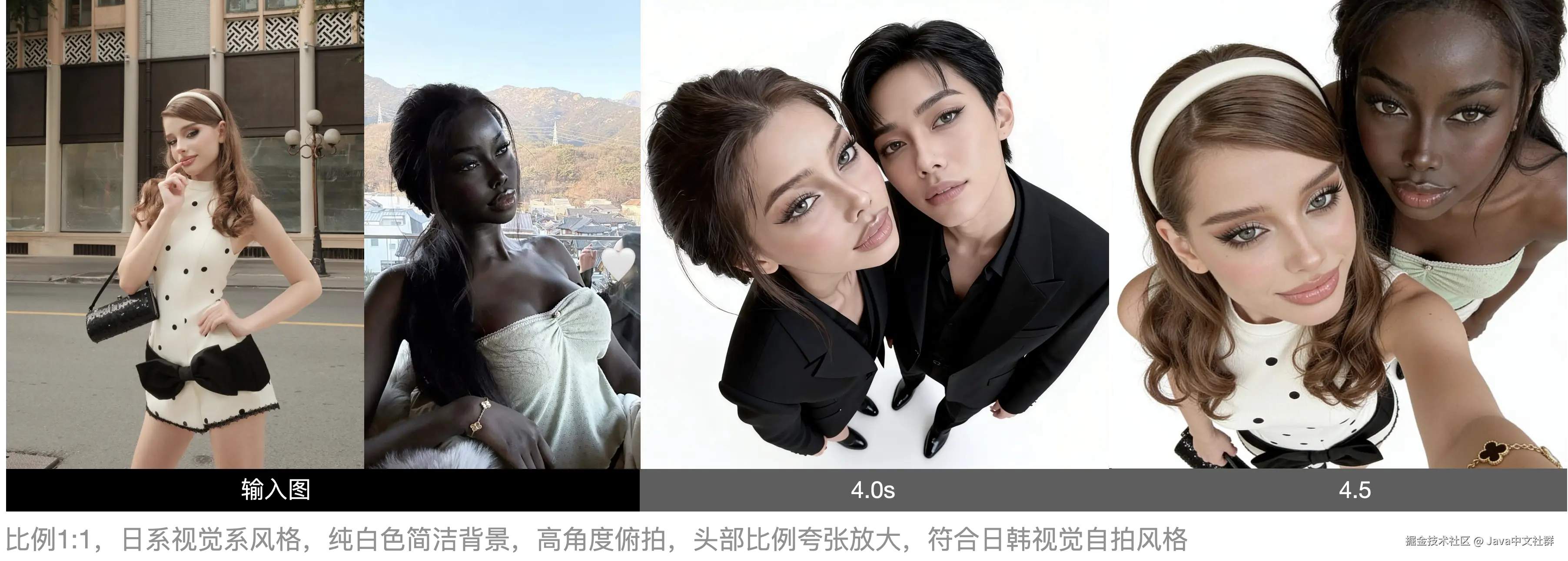 看对比图就能发现,4.0 版本容易出现人物混淆、脸部变形;而 4.5 生成的图片,不仅和原图保持了极高的一致性,自带的美颜美体效果也更自然了。