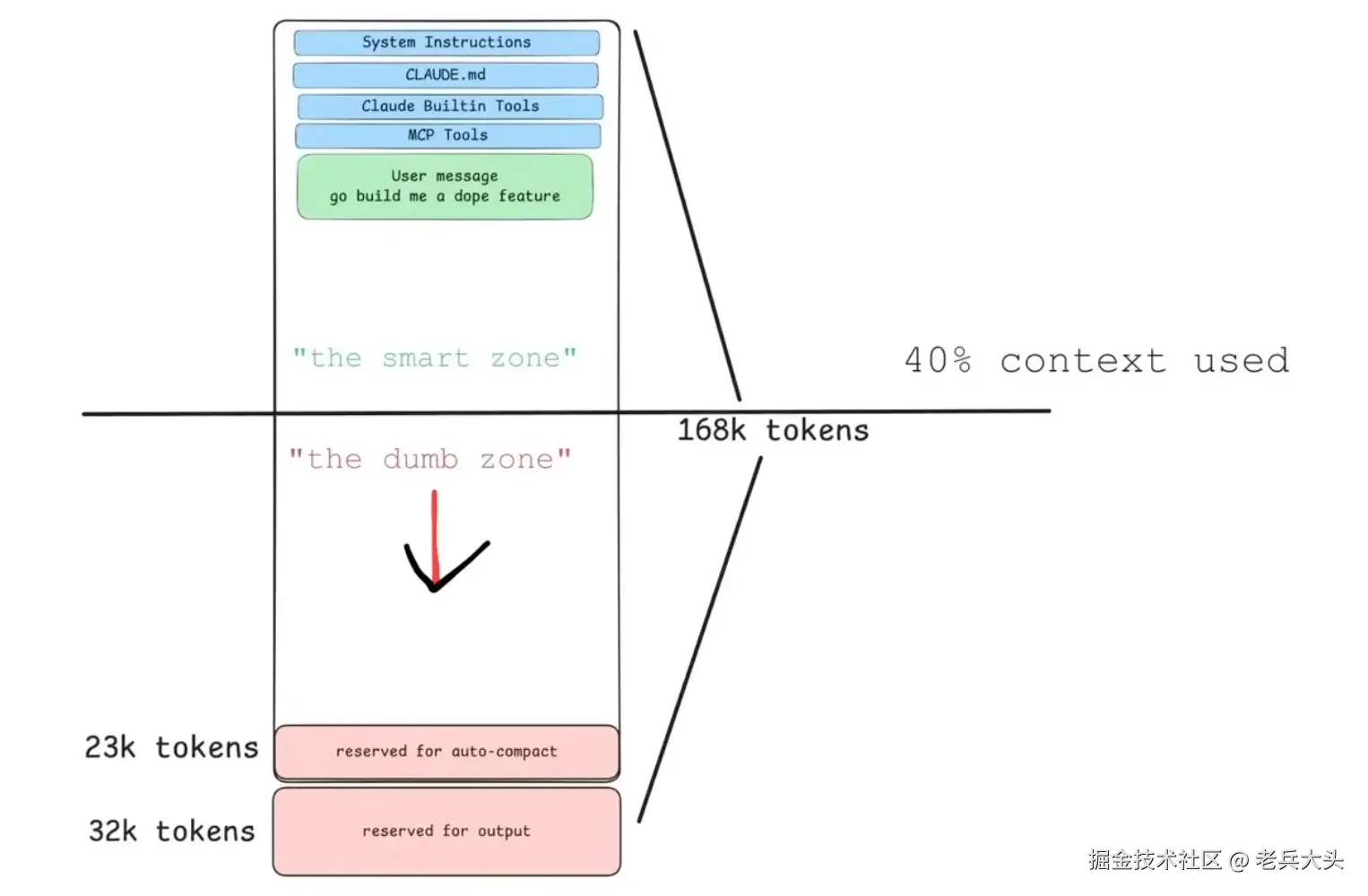 每个大型语言模型(LLM)都有个 “上下文窗口”(Context Window),也就是它的短期记忆。但这个记忆空间有个致命的性能拐点——我们可以称之为 “愚蠢区”(The Dumb Zone)。研究表明,一旦上下文的使用率超过某个阈值(比如 40%),模型的智商就会呈断崖式下跌。