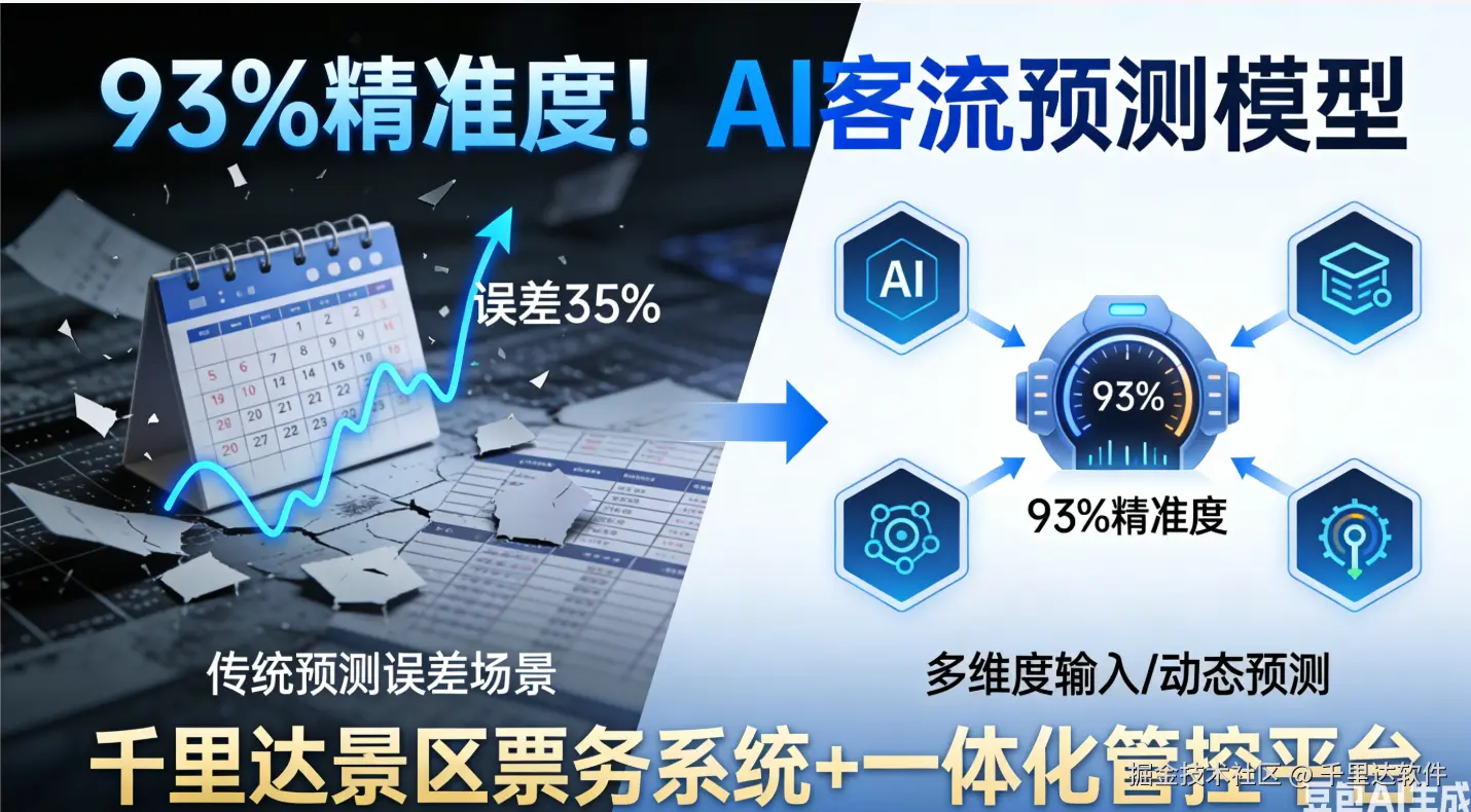 客流预测是景区运营的 “导航仪”,精准度直接影响人力排班、物资储备、限流管控等核心决策。但传统预测依赖 “单一历史数据 + 人工经验”,难以应对复杂场景(如天气突变、预售票爆发、交通管制),预测误差常超 30%。而千里达智慧景区依托 “千里达景区票务系统” 的全场景数据采集能力,结合 “千里达智慧景区一体化管控平台” 的多源数据整合与 AI 建模能力,构建 “四大维度数据输入 + 智能特征工程 + 迭代训练” 的 AI 客流预测模型,实现 93% 的预测精准度,让景区从 “经验预判” 转为 “数据决策”!