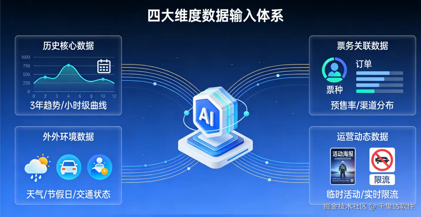 AI 客流预测模型的精准度,本质是 “数据维度的全面性” 与 “数据关联的有效性”。模型以 “历史为基、实时为核、外部为补、运营为调”,构建四大数据输入维度,所有数据均通过千里达景区票务系统与一体化管控平台实现自动化采集、整合与更新: