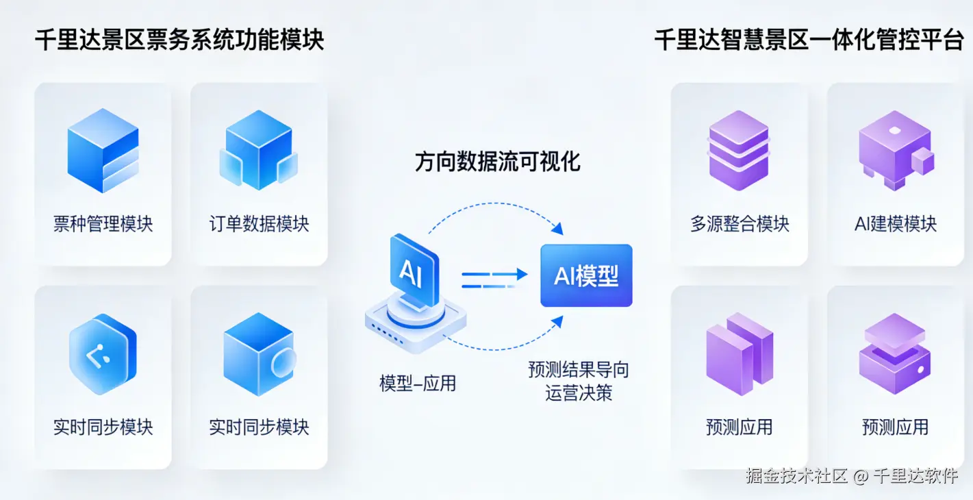 AI 客流预测模型的落地,离不开千里达景区票务系统与千里达智慧景区一体化管控平台的深度协同,两者从 “数据采集、整合、建模、应用” 全流程提供支撑: