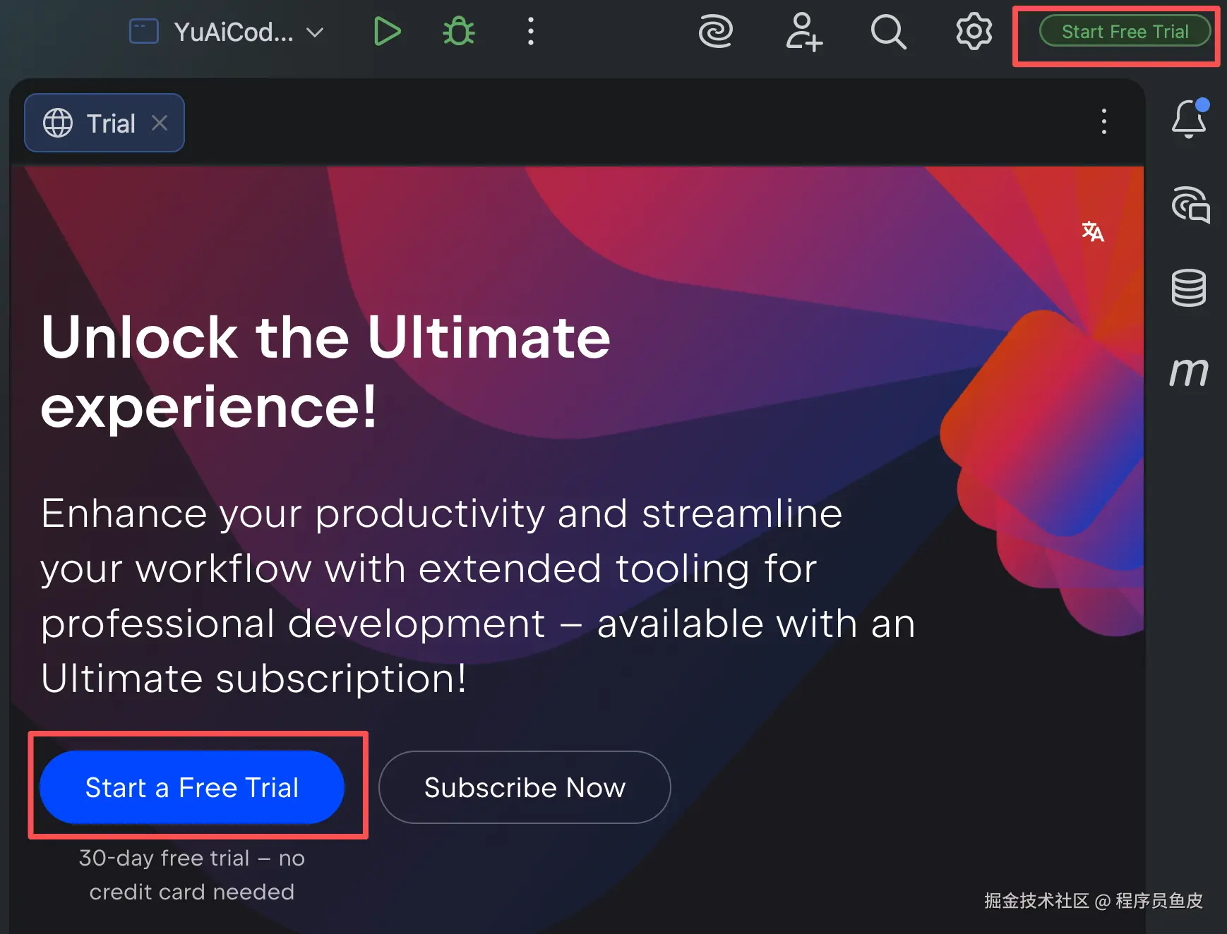 在统一版 IDEA 中,订阅 Ultimate 可以解锁所有高级专业功能。但即使没有订阅,IDEA 依然能够正常使用,可以 免费用于商业和非商业项目,畅享 Java 和 Kotlin 开发所需的全部功能。