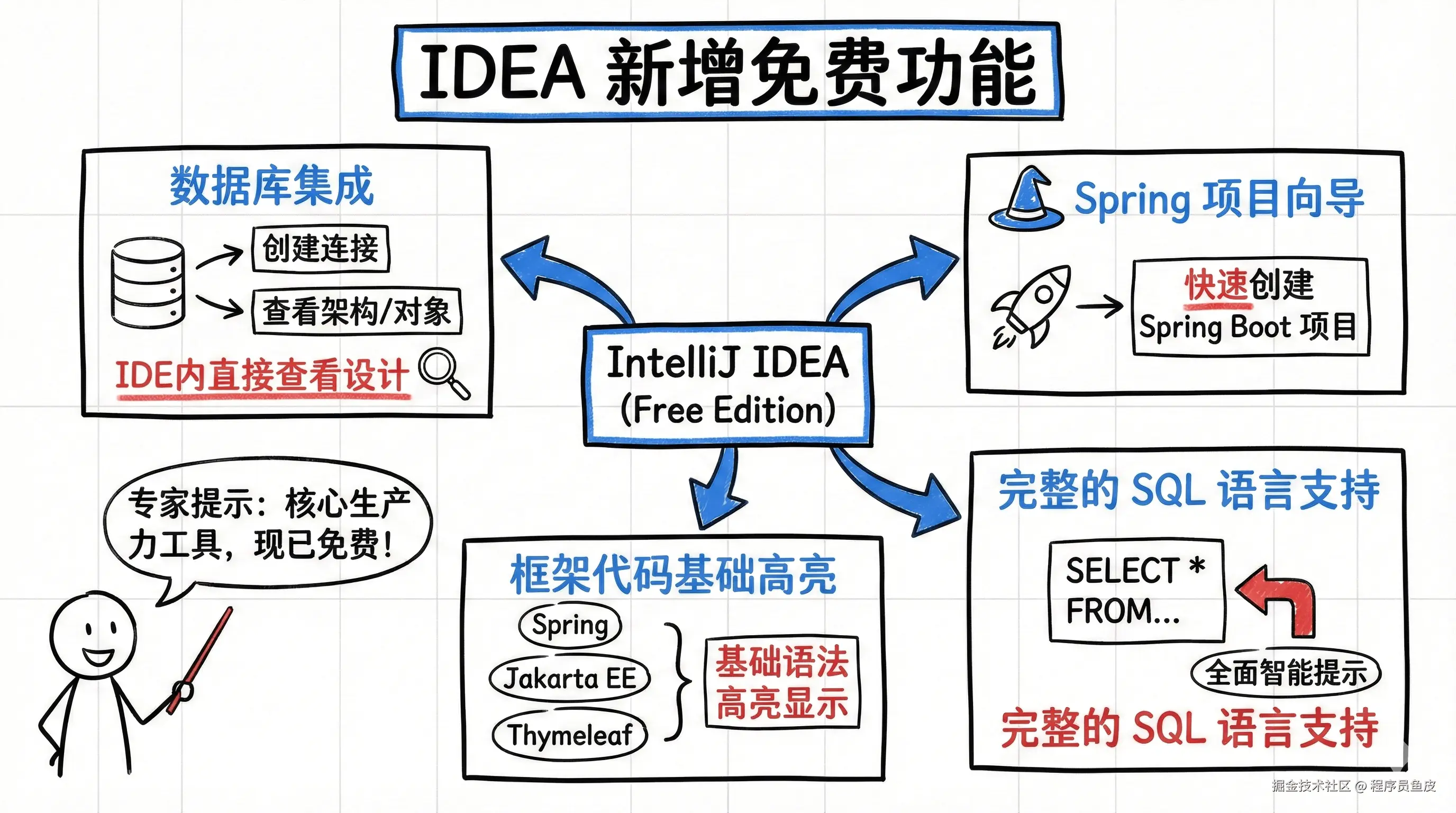 以前 IDEA 社区版支持的开发框架很有限,连使用 Java 主流的 Spring 框架开发都会受到限制,这也是为什么那么多人 想方设法 都要使用 Ultimate 版本的原因。可以说,不开 Ultimate 版本 IDEA 就废了!