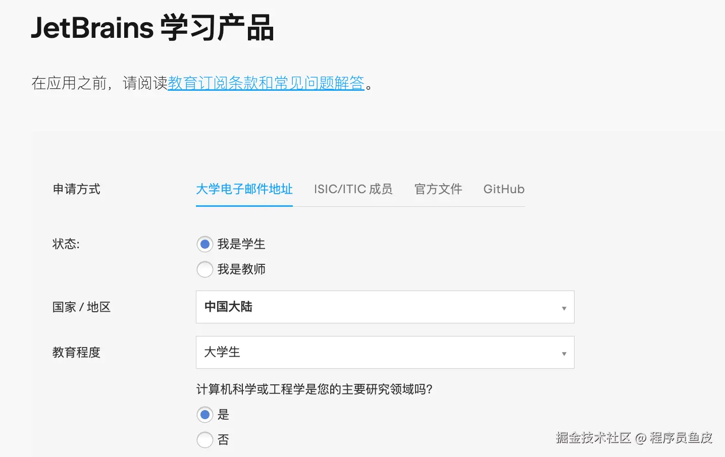 顺便说一句,如果你是教育工作者或者学生,可以通过 JetBrains 官方的 教育许可证申请页面 免费申请 Ultimate 订阅,畅享所有高级功能。