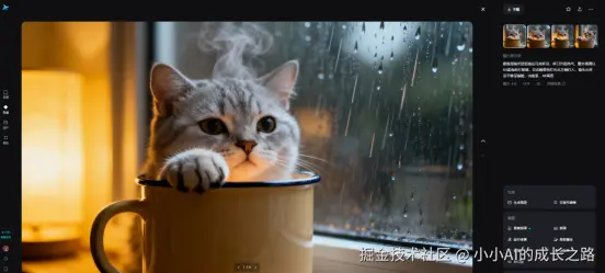 但即梦AI的文生视频功能改变了游戏规则。输入"银渐层猫爪轻轻搭在马克杯沿,杯口升起热气,窗外雨滴斜打玻璃,日式暖黄色灯光从左侧打入,镜头从杯沿平移至猫脸,治愈系,4K画质",生成图片后,再用"更换场景、动物、物品等属性"功能批量产出5个版本,最后批量转视频。
