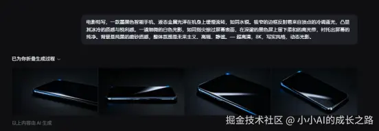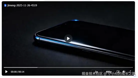 租摄影棚?凌晨场租就要上千,实拍根本不可能。我打开即梦AI,上传产品白底图,敲下提示词:"电影特写,墨黑色智能手机,液态金属光泽缓慢流转,极窄边框反射冷调蓝光,一道白色光影如指尖掠过屏幕,背景纯黑磨砂,未来主义、高端、静谧——超高清,8K,写实风格,动态光影。"