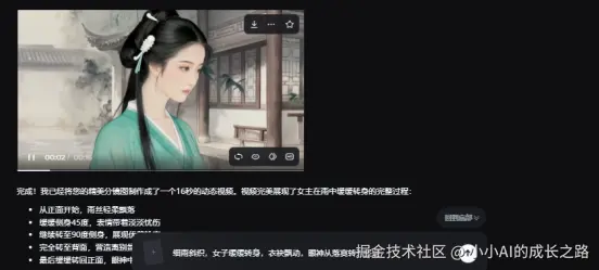 进入"智能多帧"模式,按顺序上传这5张图,开启"脸部ID锁定"和最高档"叙事连贯性",输入"细雨斜织,女子缓缓转身,衣袂飘动,眼神从落寞转为坚定"。1分20秒后拿到16秒视频,逐帧检查:脸部轮廓偏差小于2像素,簪子位置纹丝不动,连眼角的泪痣都稳定在第3帧出现。