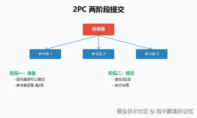 缺点: ❌ 同步阻塞 - 所有参与者等待期间会阻塞 ❌ 单点故障 - 协调者挂了,整个系统不可用 ❌ 数据不一致 - 部分参与者可能收不到指令 ❌ 性能极差 - 锁定资源时间长