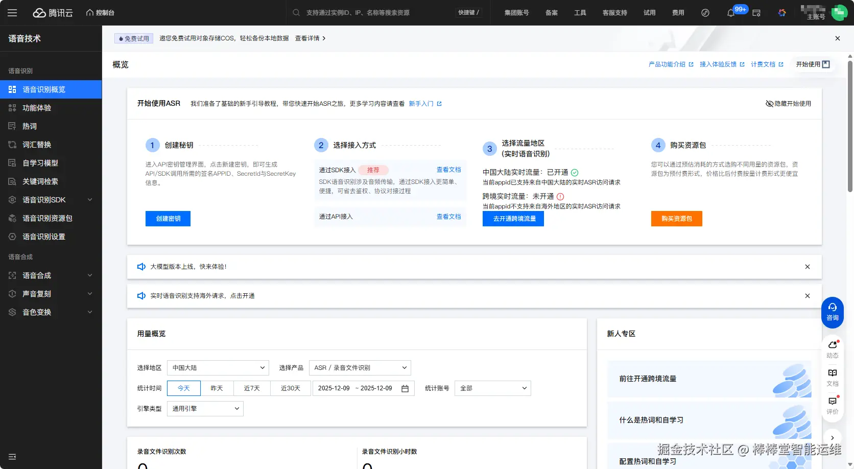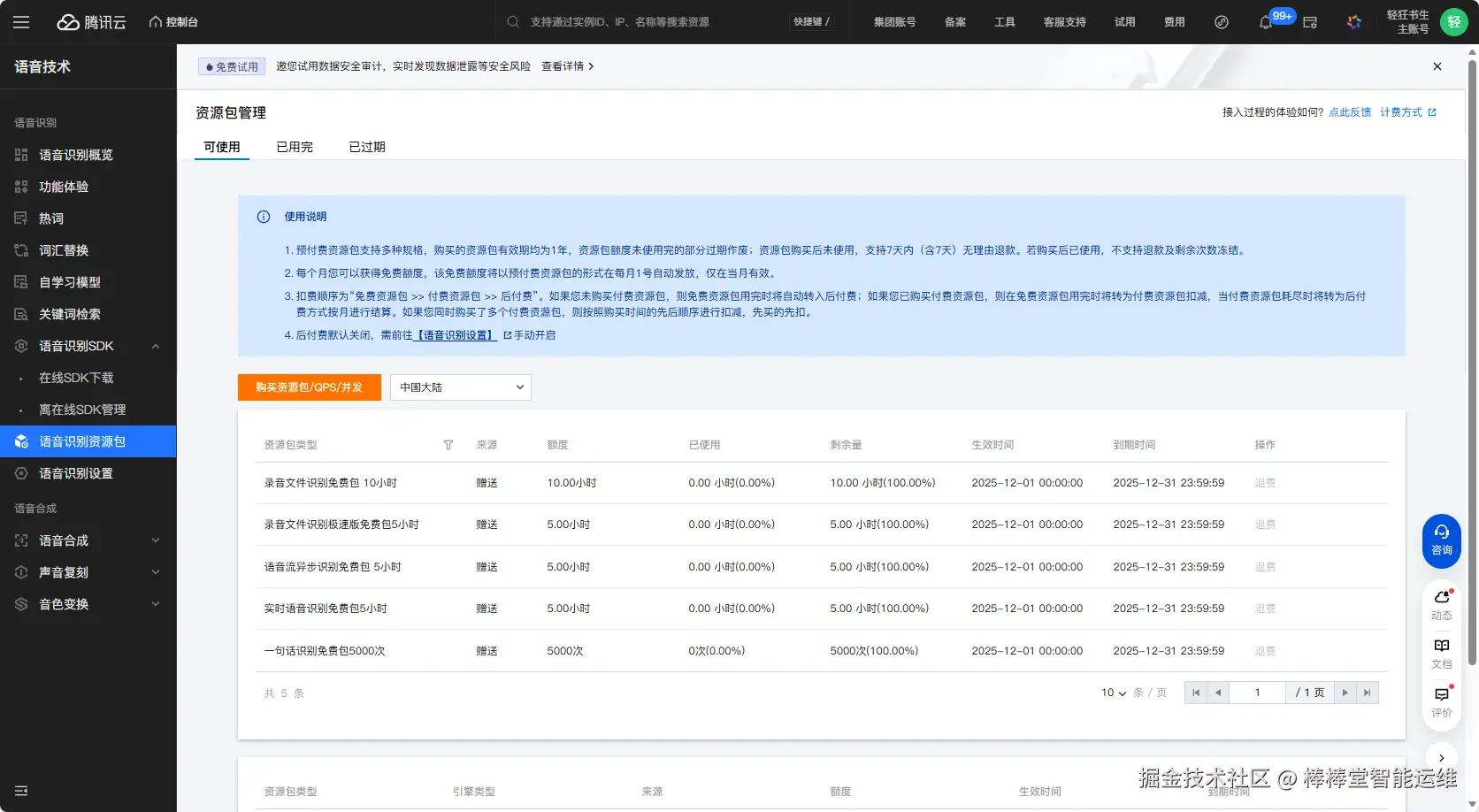 步骤3: 点击“立即使用”或“开通服务”按钮,开通语音识别服务。首次开通通常会有免费资源包,如“新客0元体验包”,请留意领取。