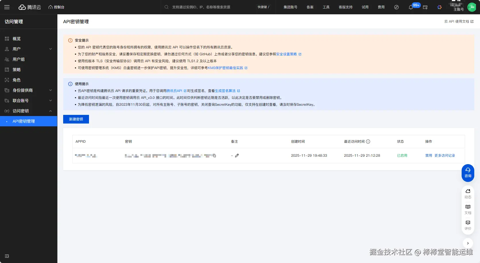 (1)进入腾讯云控制台(),访问API密钥管理页面。