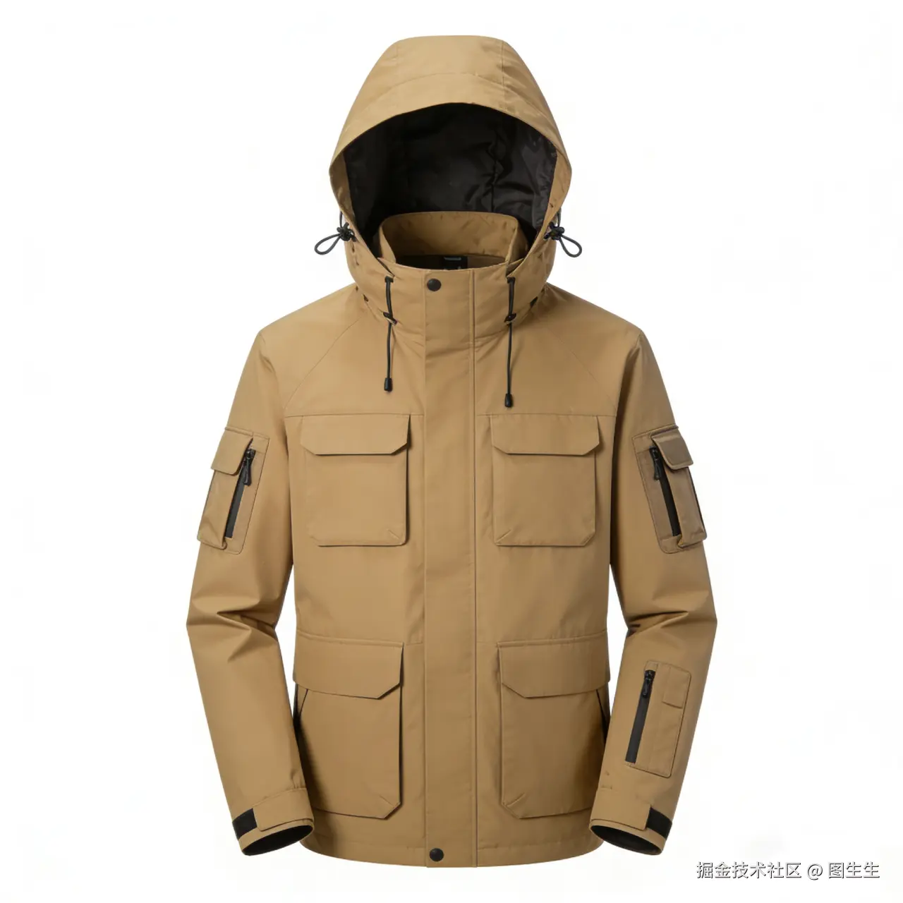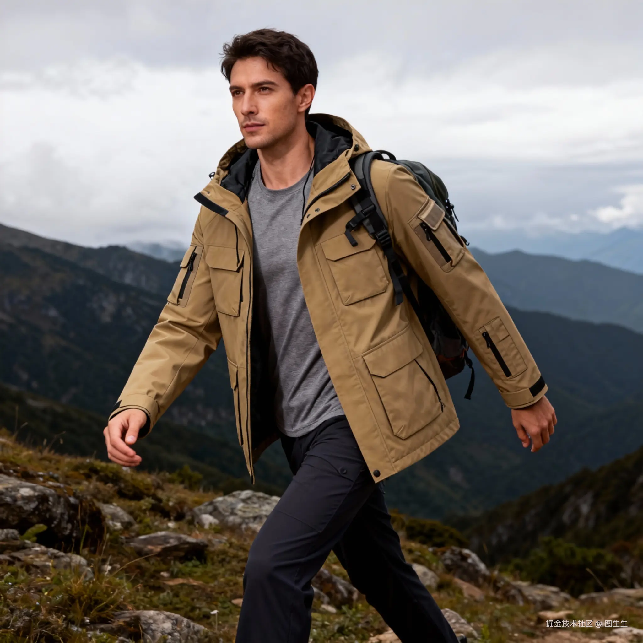 生成成果:模特行走姿势自然,冲锋衣防水质感与多口袋清晰,山间场景真实,适配户外店、跨境平台主图,凸显实用性。