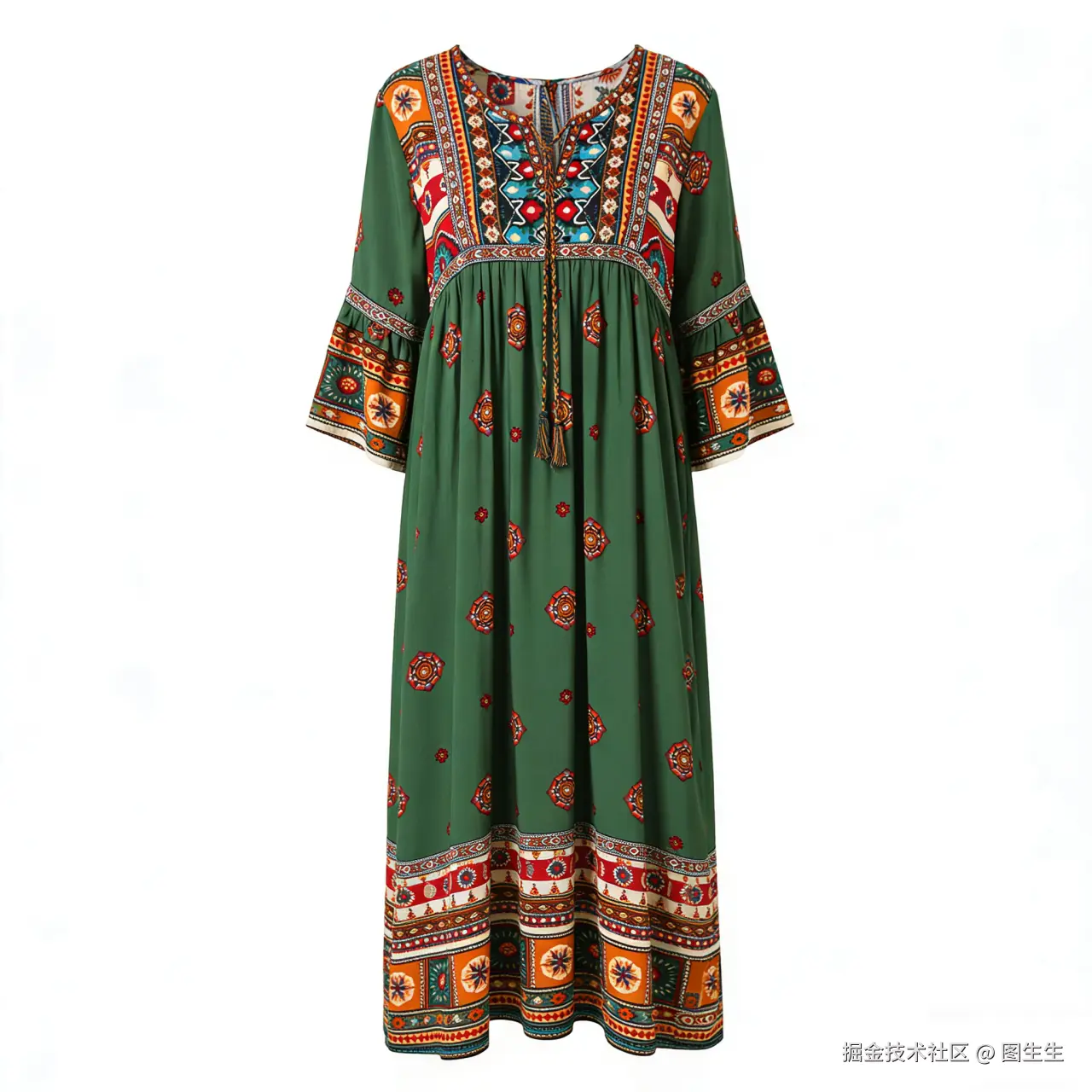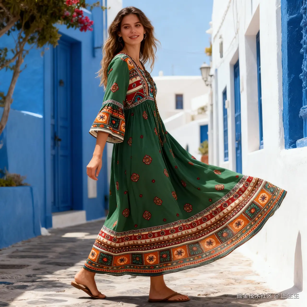👉输入指令:“欧美模特,穿这件波西米亚长裙,在希腊圣托里尼蓝白小镇散步,模特侧身站立,裙摆自然飘动”