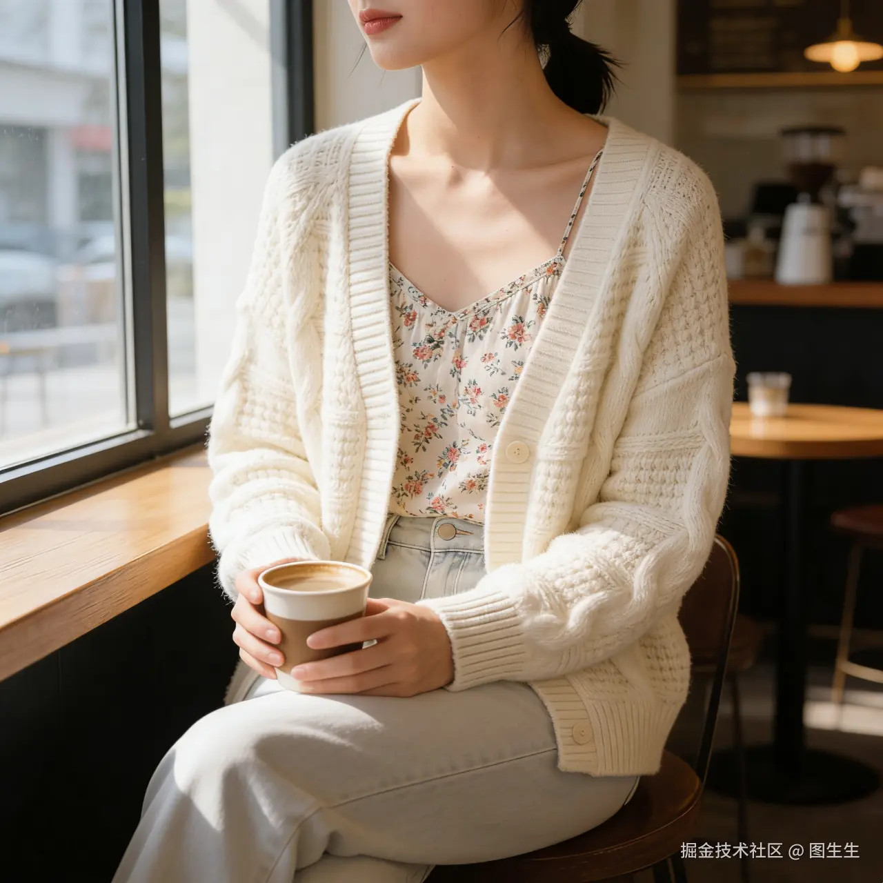 👉输入指令:“一个韩系温柔风模特,穿这件针织开衫内搭碎花吊带,搭配浅色直筒牛仔裤,咖啡馆靠窗位置,自然光,模特手捧咖啡杯,坐姿优雅”