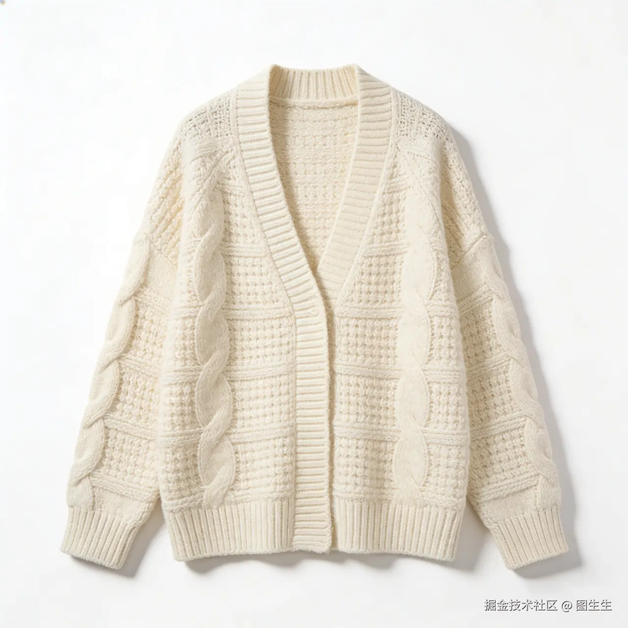 生成成果:模特优雅坐姿,开衫软糯纹理清晰,咖啡馆自然光氛围柔和,搭配和谐,适配淘宝详情页、直播封面,契合韩系温柔调性。