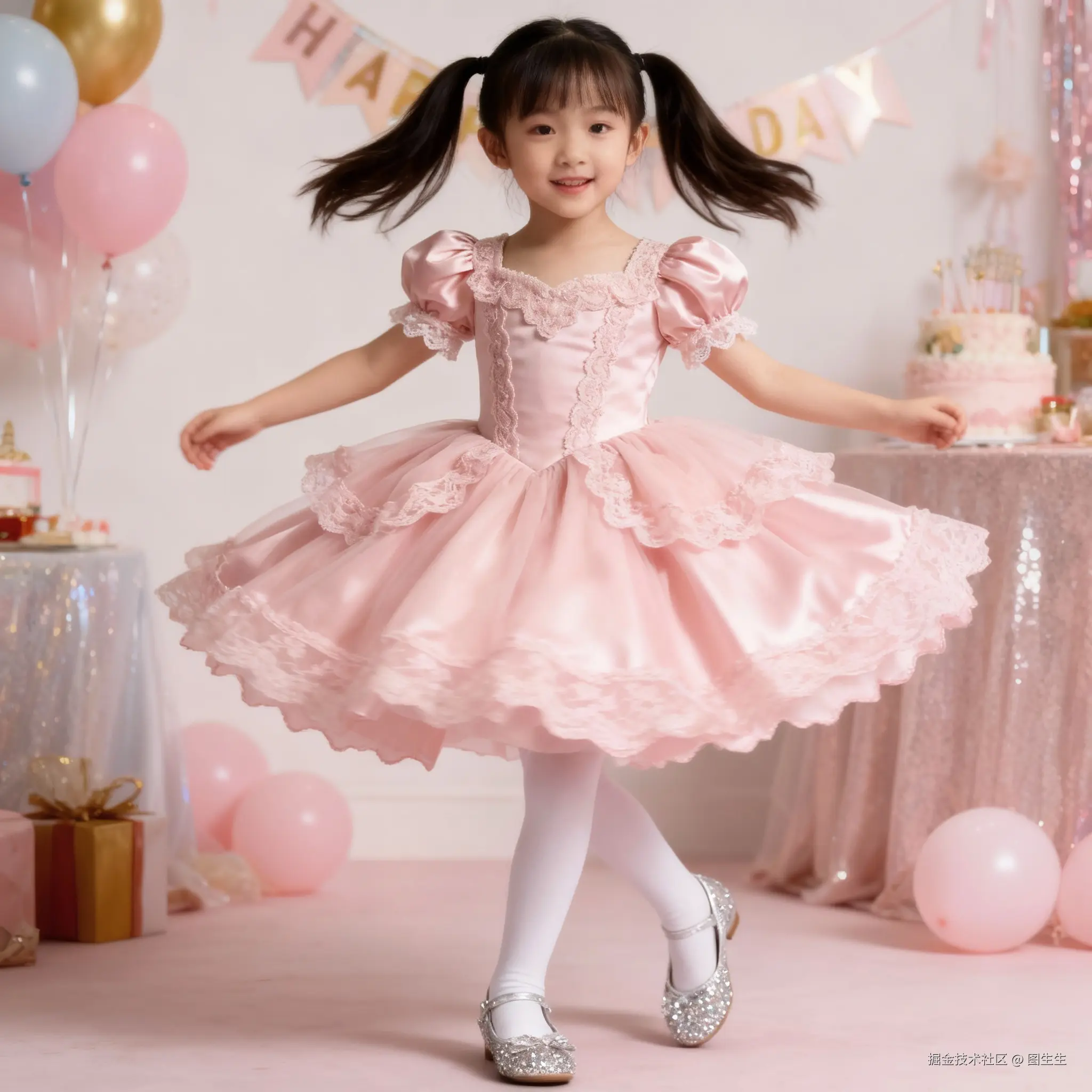 👉输入指令:“亚洲女童,穿这件公主裙,搭配白色长袜+银色水晶鞋,生日派对场景,亮色调,女童扎双马尾,做转圈动作”