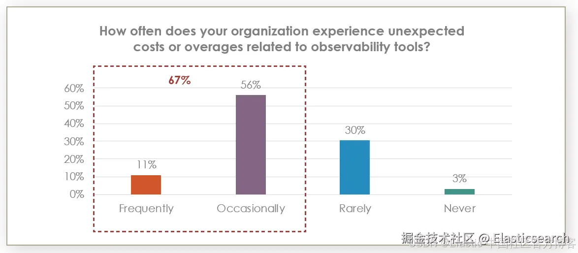 随着可观测性实践的成熟,成本管理已成为关键优先事项。研究显示,意外成本和超支在可观测性实施中普遍存在,97% 的组织经历过成本意外。更令人关注的是,67% 的组织报告这些意外成本经常发生,其中 11% 经常遇到。