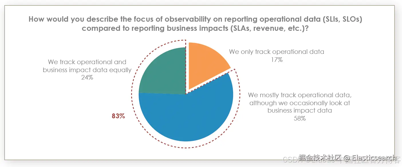 仅有 17% 的可观测性团队专注于运营数据,例如服务级别指标(SLIs)和服务级别目标(SLOs)。在另一端,24% 的受访者将业务影响指标(包括服务级别协议 SLA、收入影响和客户体验)提升到与运营数据同等重要的地位。大多数(58%)仍以运营指标为主要关注点,同时将业务影响视为附加价值。