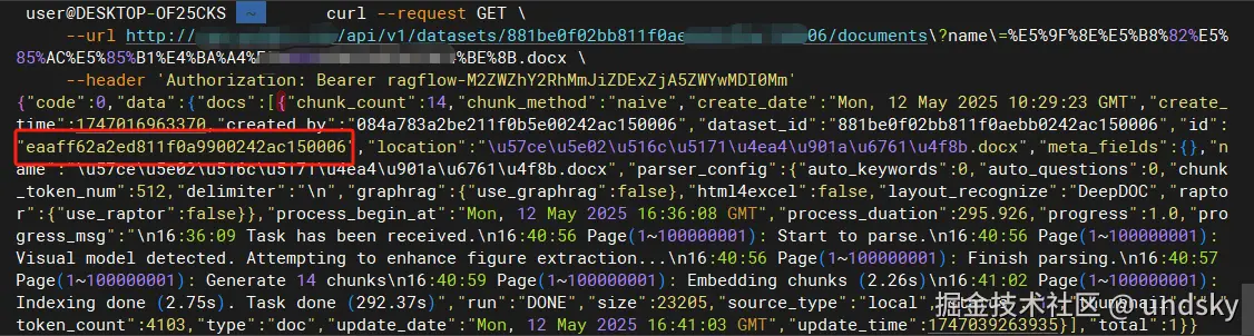 dataset_id:知识库 ID(在上面第四步的截图中可以找到)document_id:文档的真实 ID(需要通过查询获取)
