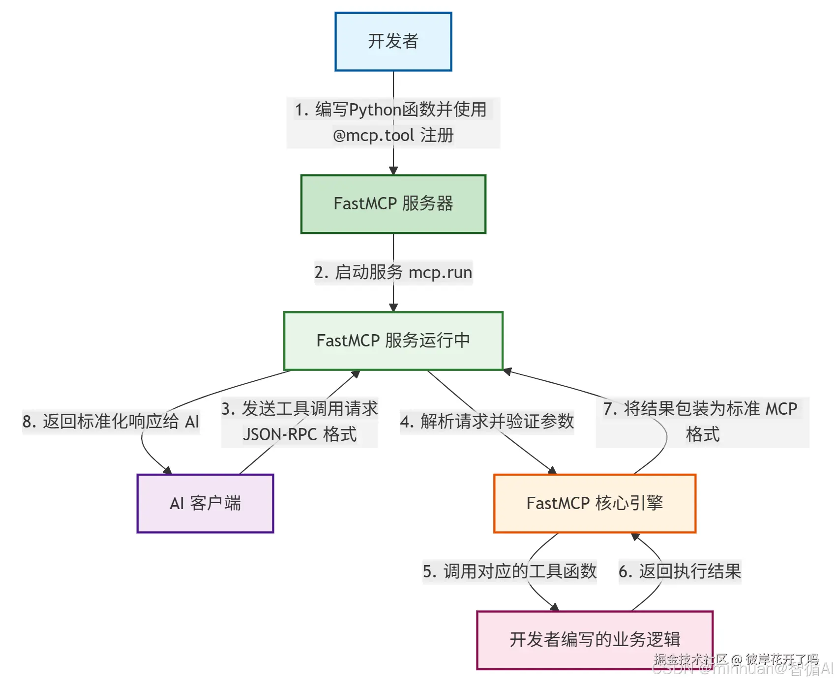 FastMCP 之所以能简化 “AI 连接工具” 的过程,核心是在流程中做了 3 个关键 “减负” 动作: