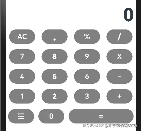 - 按钮组:5行布局,包含清除(AC)、小数点、取余(%)、四则运算、数字0-9、等号,按钮样式统一且易点击。